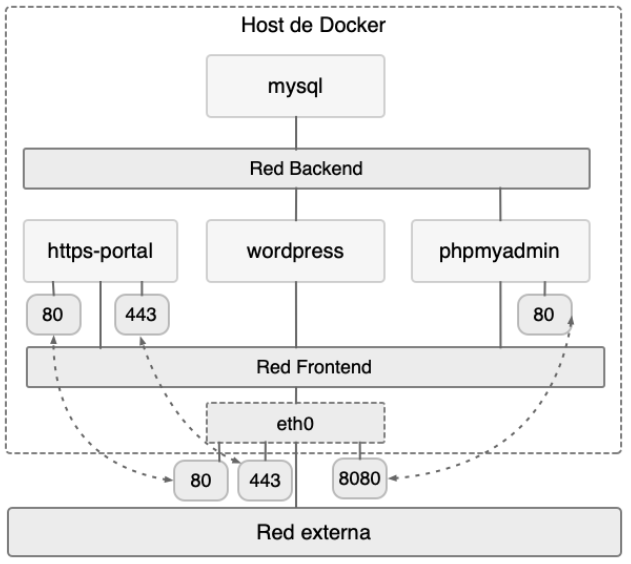 Para la siguiente práctica vamos a crear una estructura de back y front de wordpress, junto a una máquina que realiza los retos de Let's Encrypt, todo ello mediante aplicaciones contenedorizados, siguiendo la siguiente estructura: