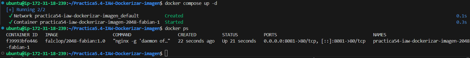 Lo lanzamos con:services: 2048-fabian: image: falclop/2048-fabian:1.0 ports: - 8081:80docker compose up -d