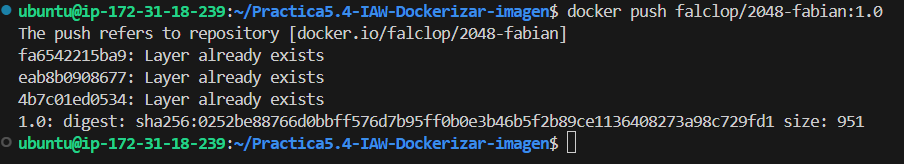 - Cuando tenemos listo la imagen, la instalación es correcta y funciona todo, podemos subir la imagen a nuestra cuenta de DockerHub, para ello primero haremos: